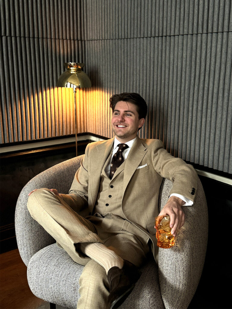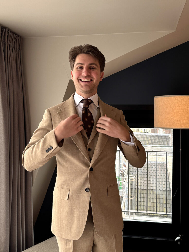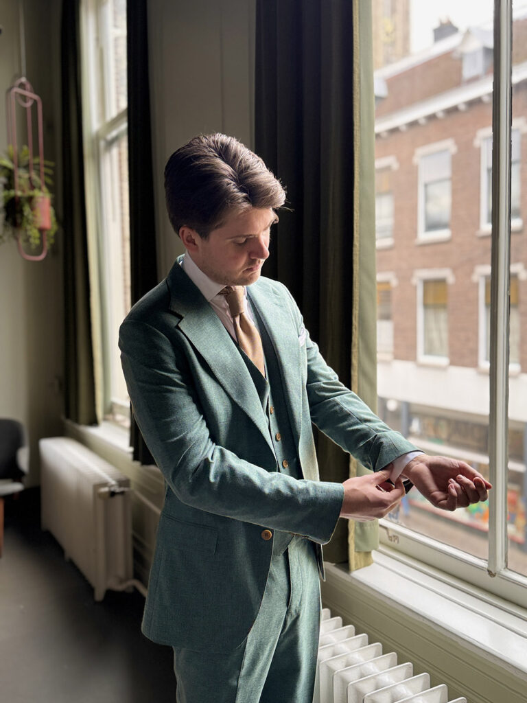 Naast blauw maken we relatief veel pakken in terracotta, zand en groen. Al deze kleuren zijn verrassend veelzijdig. Zeker als er structuur in de weving en stof zit, is het makkelijk te combineren. Ook kunnen de broek en jas dan goed los van elkaar gedragen worden. Dat gaat veel mannen nog steeds te ver. Een pak is immers een pak. Toch dagen we je uit om kledingstukken te gaan combineren met bijvoorbeeld een spijkerbroek, chino of een witte broek. Het oogt direct minder formeel dan een heel pak en is toch verzorgd en echt serieuzer dan alleen een chino met een hemd en een trui.